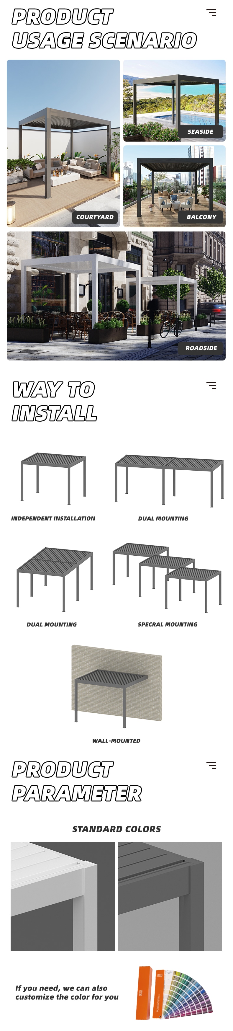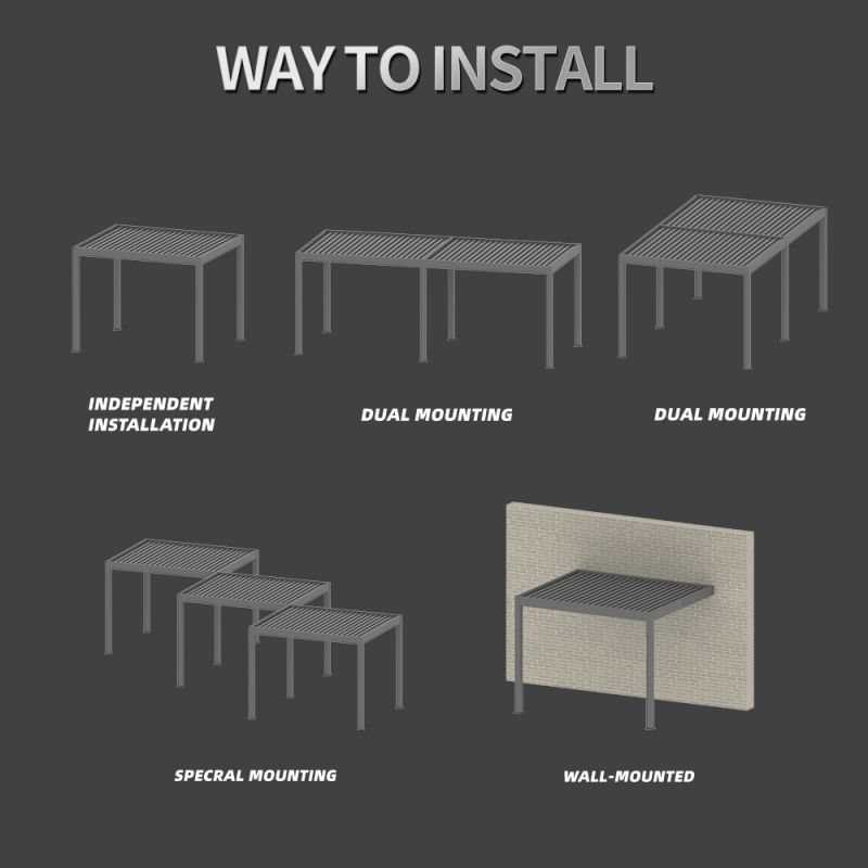 Single pergola installation biggest size is 6000 mm X 4500mm,and the same direction infinite splicing.